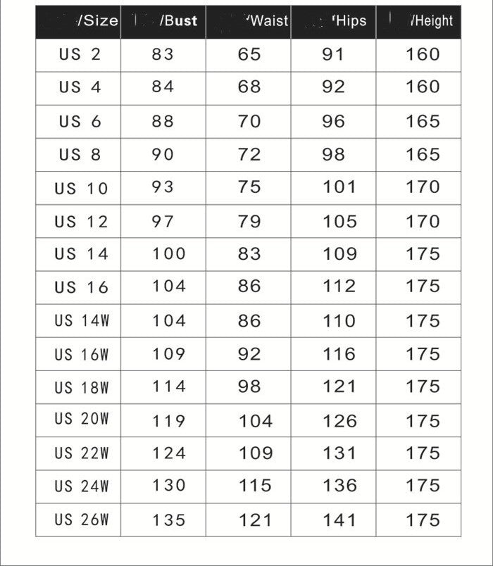 Size: 2,4,6,8,10,12,14,16,14W, 16W, 18W, 20W, 22W, 24W, 26W