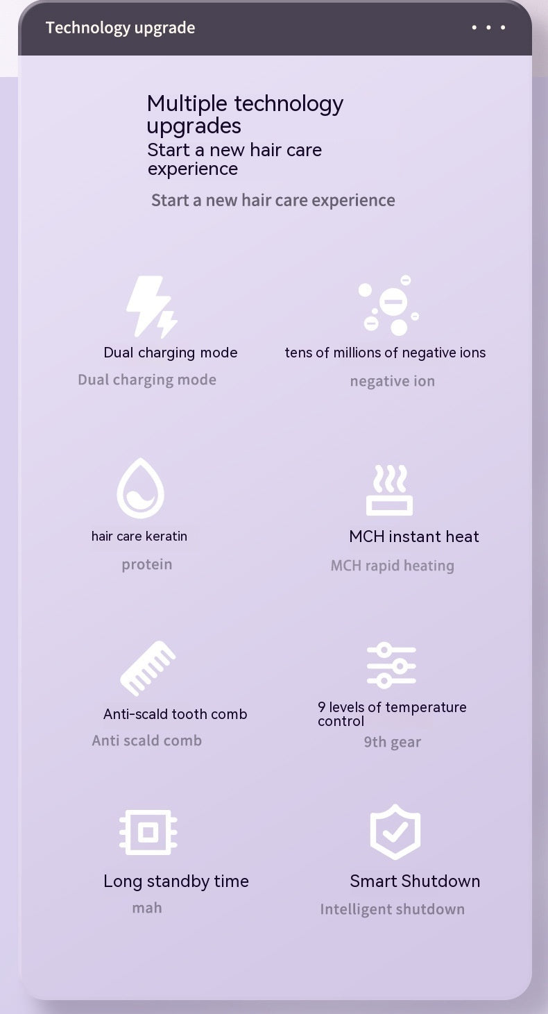 Product information: Power: Matte White, Royal Black Power supply mode: Wireless (lithium battery) Rated Power: 35 Rated Voltage: 7.2 Additional functions: negative ion, intelligent charge and discharge display. Machine size: 200*45 * 44mm Base size: 90*80 * 55mm Box size: 320*97 * 57mm Thermal conductor material: tourmaline ceramics