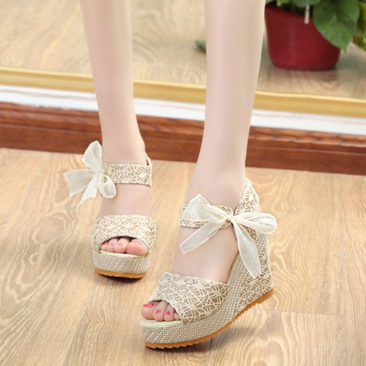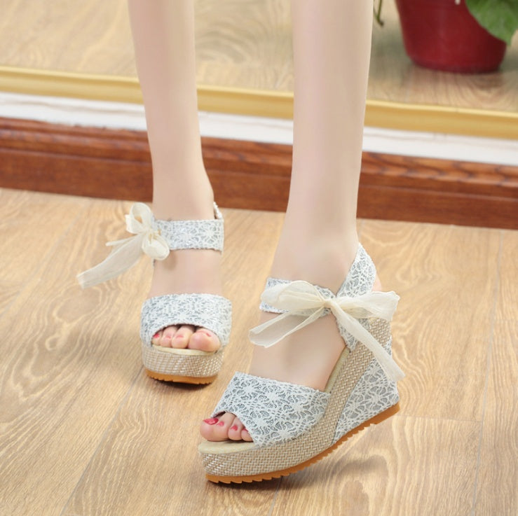 Sweet Ribbon Sandals Upper material: mesh Sole material: Rubber Style: sweet Toe shape: fish mouth Heel shape: wedge heel Heel height: 6-8cm
